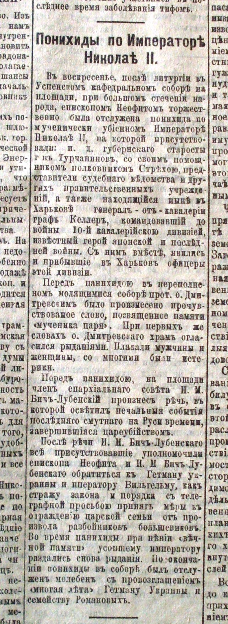 После речи И.М. Бич-Лубенского все присутствовавшие уполномочили епископа Неофита и И.М. Бич-Лубенского обратиться к Гетману Украины и императору Вильгельму, как стражу закона и порядка, с телеграфною просьбою принять меры к ограждению царской семьи от произвола разбойников большевиков. Во время панихиды при пении «вечной памяти» усопшему императору раздались снова рыдания. По окончании панихиды в соборе был отслужен молебен с провозглашением «многая лета» Гетману Украины и семейству Романовых.