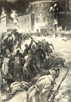 А в эти часы вот что происходило в городе и за городом. Запасные войска, их было, как говорят, до 20 тысяч, пошли в город беспорядочной массой. К ним пристали рабочие с загородной фабрики «Морозовской мануфактуры». И эти тысячи направились, конечно, к центру власти — губернаторскому дому. А некоторые из солдат, заночевавшие в городе, успели уже учинить убийство… Пишу по циркулировавшим тогда слухам… Один из них не отдал чести встретившемуся молодому офицеру. Тот сделал ему выговор… Этого было довольно… Офицера оскорбили как-то еще. А он тоже не сдержался, и толпа хотела учинить над ним насилие. Он побежал, толпа за ним. Он спрятался на чердаке церковного дома. Но его там нашли и выбросили через слуховое окно с третьего этажа на землю… Очень дурное предзнаменование.