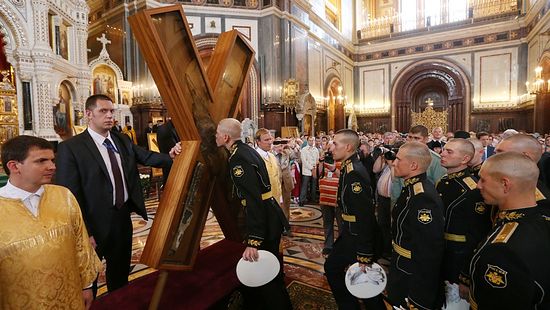 09:20 Станция метро «Кропоткинская». К выходу спешат женщины в белых платочках и немолодой мужчина с длинной бородой, но, проявляя послушание Штабу по организации пребывания Креста апостола Андрея Первозванного в городе Москве («не выходите на станции метро “Кропоткинская”, — это удлинит дорогу»), проплываю в вагоне мимо. Тем временем вспоминается первое «знакомство» с Апостолом — из 90-х.