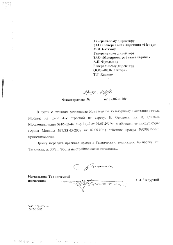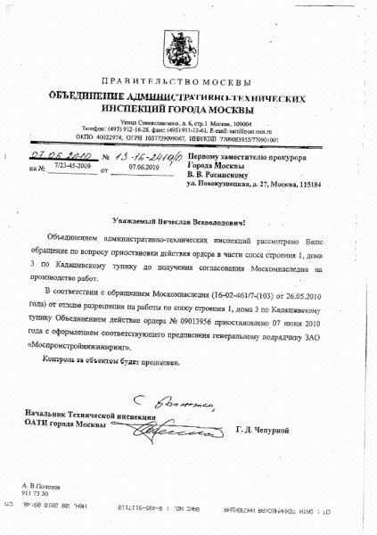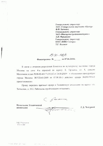 Пакет документов по отзыву ордера ОАТИ на снос зданий в Кадашах