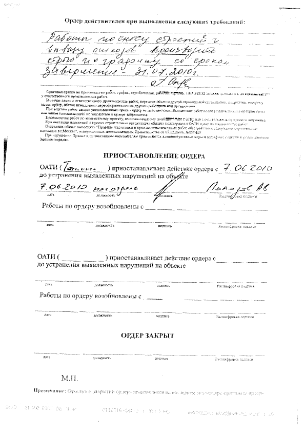 1. Ордер ОАТИ № 09013956/3 от 5 мая 2010 г ., на основании которого застройщик начал снос. Согласно этому документу разрешен снос 4 единиц строений, без указания их точного адреса. Ордер подписан заместителем начальника технической инспекции Г.Е. Скрылевой. Работы предписано завершить до 31 июля (исправлено: декабря) 2010 г.