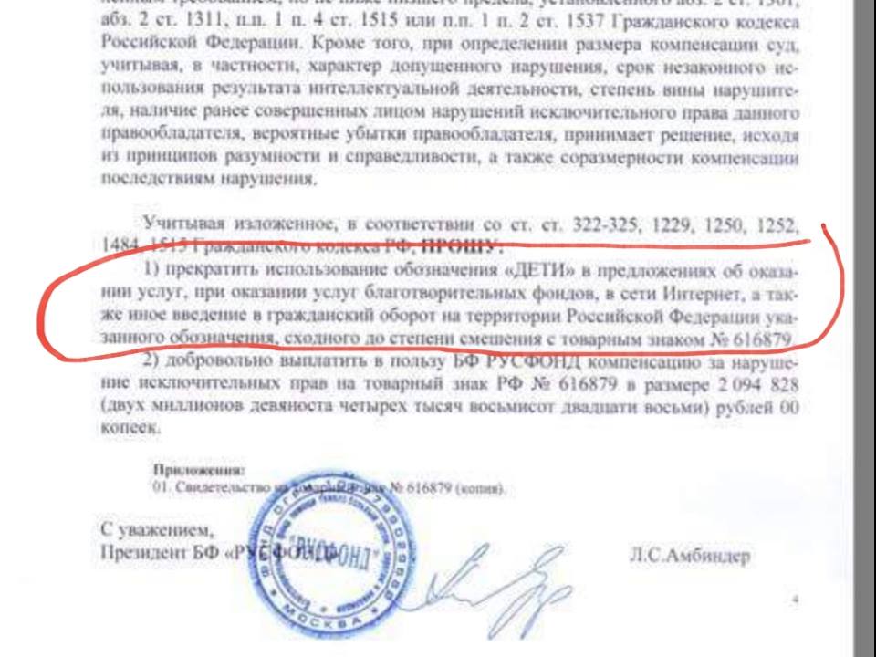 В досудебной претензии “Русфонда”, которая опубликована в широком доступе, содержатся требования лишь по вопросу использования товарного знака “5542 ДЕТИ”, в то время как на сайте “Русфонда” утверждается, что фонд «Подари завтра!» почти год собирал пожертвования в мобильном банке Сбербанка, используя оба эти слова.