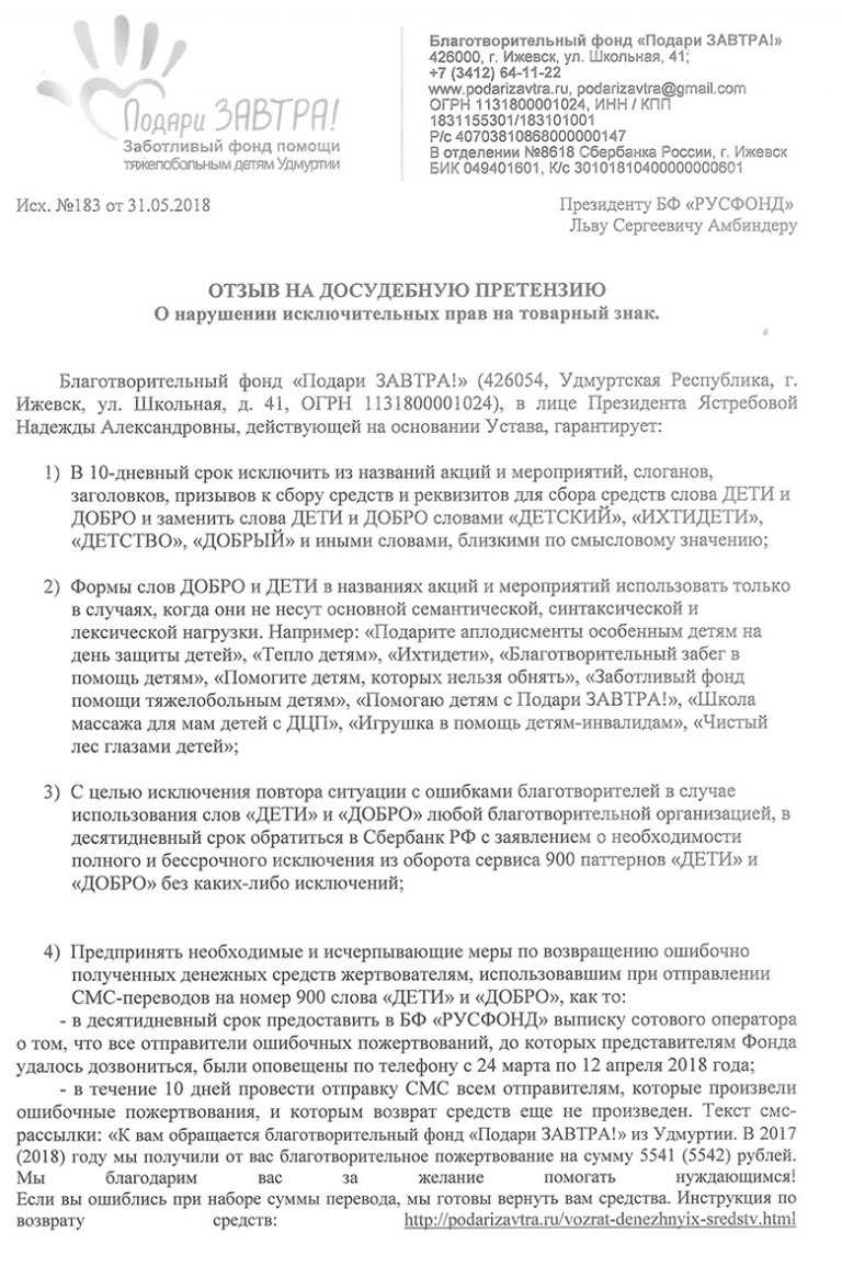 Чтобы не подписывать эти требования, фонд “Подари ЗАВТРА” составил свой ответ на досудебную претензию “Русфонда”, где заявил о готовности отказаться от использования этих слов в названиях акций, мероприятий, в заголовках, призывах к сбору средств и реквизитах. Исключение составляют случаи, когда слова «Добро» и «Дети» не несут «основной семантической, синтаксической и лексической нагрузки».