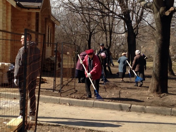 Сейчас идет второй год нашей богослужебной жизни. Первое богослужение было на Пасху в 2014 году. И перед тем, как начались богослужения, мы собрали большой субботник по уборке всего парка. Когда снег стаял, обнажился мусор, бутылки, пакеты. Нам очень хотелось, чтобы храм открылся в чистом парке. Нас даже управа попросила убрать парк. Мы организовали прихожан, провели три субботника, в которых принимали участие десятки людей. Парк полностью очистили от мусора.