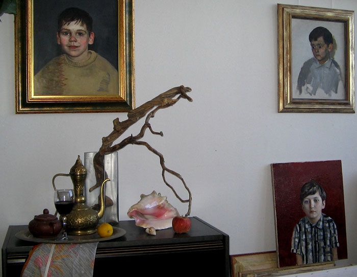 То, что вы видите на стенах, это то, что я писал для себя. Например, писал я групповой портрет, где было много персонажей, это был такой многофигурный портрет, из одиннадцати человек. И вот там были дети, и я писал с них этюды. И какие-то этюды тоже купили родители, но один остался у меня. И так и с другими работами.