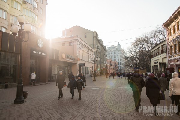 Арбат заливало солнце. Люди гуляли семьями, сидели в кафе.