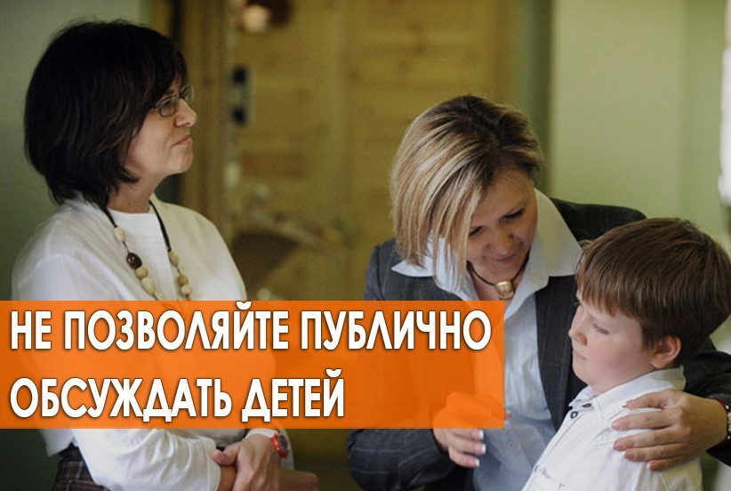 Любые попытки со стороны учителя или других родителей публично обсудить поведение, успеваемость, сравнить, пожаловаться на вашего или чужого ребенка следует жестко пресекать и не участвовать в этом. Если ситуация критическая – обсудить ее наедине, если у учителя есть традиция «разбирать» каждого ученика – надо это прекратить общим родительским протестом.