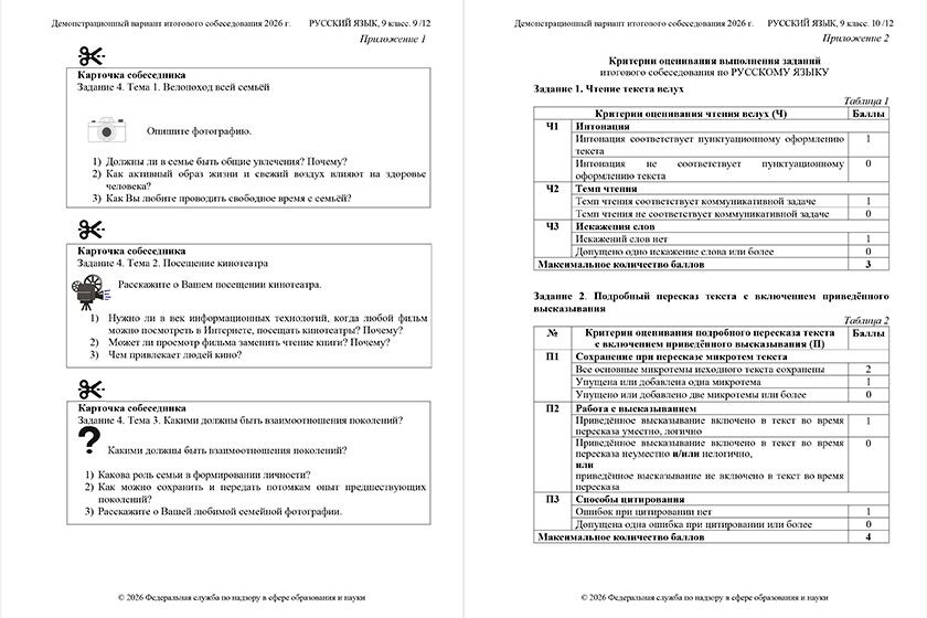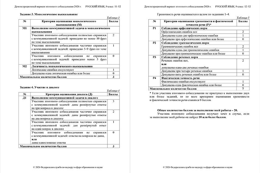 Итоговое собеседование (вот демоверсия заданий) служит допуском к государственным экзаменам, то есть к ОГЭ. Оценивается оно, на мой взгляд, мягко, потому что для «зачета» нужно набрать как минимум 10 баллов из 20. Получить «незачет» здесь довольно трудно, если ты свободно говоришь по-русски.