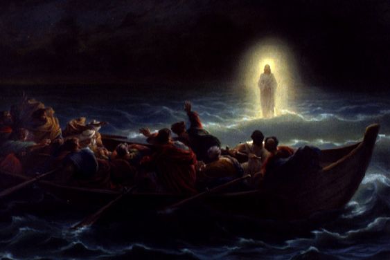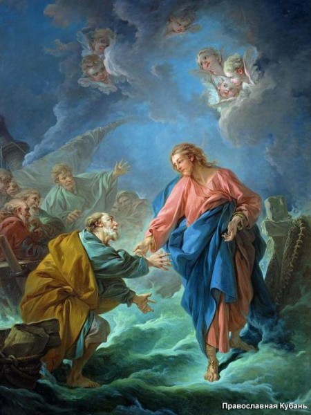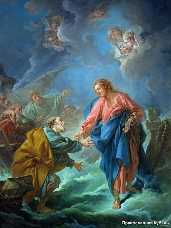 «В четвертую же стражу ночи пошел к ним Иисус, идя по морю. И ученики, увидев Его идущего по морю, встревожились и говорили: это призрак; и от страха вскричали. Но Иисус тотчас заговорил с ними и сказал: ободритесь; это Я, не бойтесь. Петр сказал Ему в ответ: Господи! если это Ты, повели мне прийти к Тебе по воде. Он же сказал: иди. И, выйдя из лодки, Петр пошел по воде, чтобы подойти к Иисусу, но, видя сильный ветер, испугался и, начав утопать, закричал: Господи! спаси меня. Иисус тотчас простер руку, поддержал его и говорит ему: маловерный! зачем ты усомнился? И, когда вошли они в лодку, ветер утих. Бывшие же в лодке подошли, поклонились Ему и сказали: истинно Ты Сын Божий». (Мф. 14,23–33).