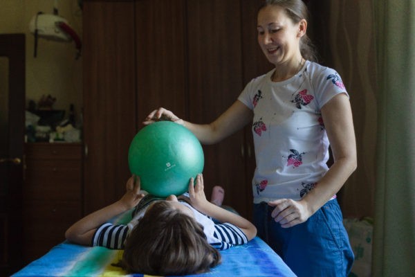 Но больше всего Кате нравятся занятия ЛФК. Инструктор сначала делает легкий массаж на разогревание всех мышц – 5-10 минут. А дальше в игровой форме они с Катей выполняют различные упражнения. Разрабатывают руки, ноги, вытягивают спину. «Катя весь день сидит в инвалидном кресле, – говорит Ольга. – Это приводит к тому, что все тазобедренные суставы «едут» – это и вывихи, и подвывихи. Все движения становятся очень болезненными. Колени почти не разгибаются. Ребенок скручен, зажат. Заниматься нужно регулярно».