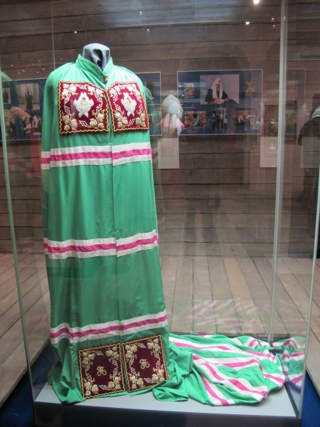 Из Исторического музея на выставку переданы также куколь и посох патриарха Тихона и принадлежавший ему в годы служения в Ярославле напрестольный крест. Здесь же мантия патриарха Пимена, саккосы, омофоры и палицы патриархов Алексия I и Сергия, облачения патриарха Алексия II.