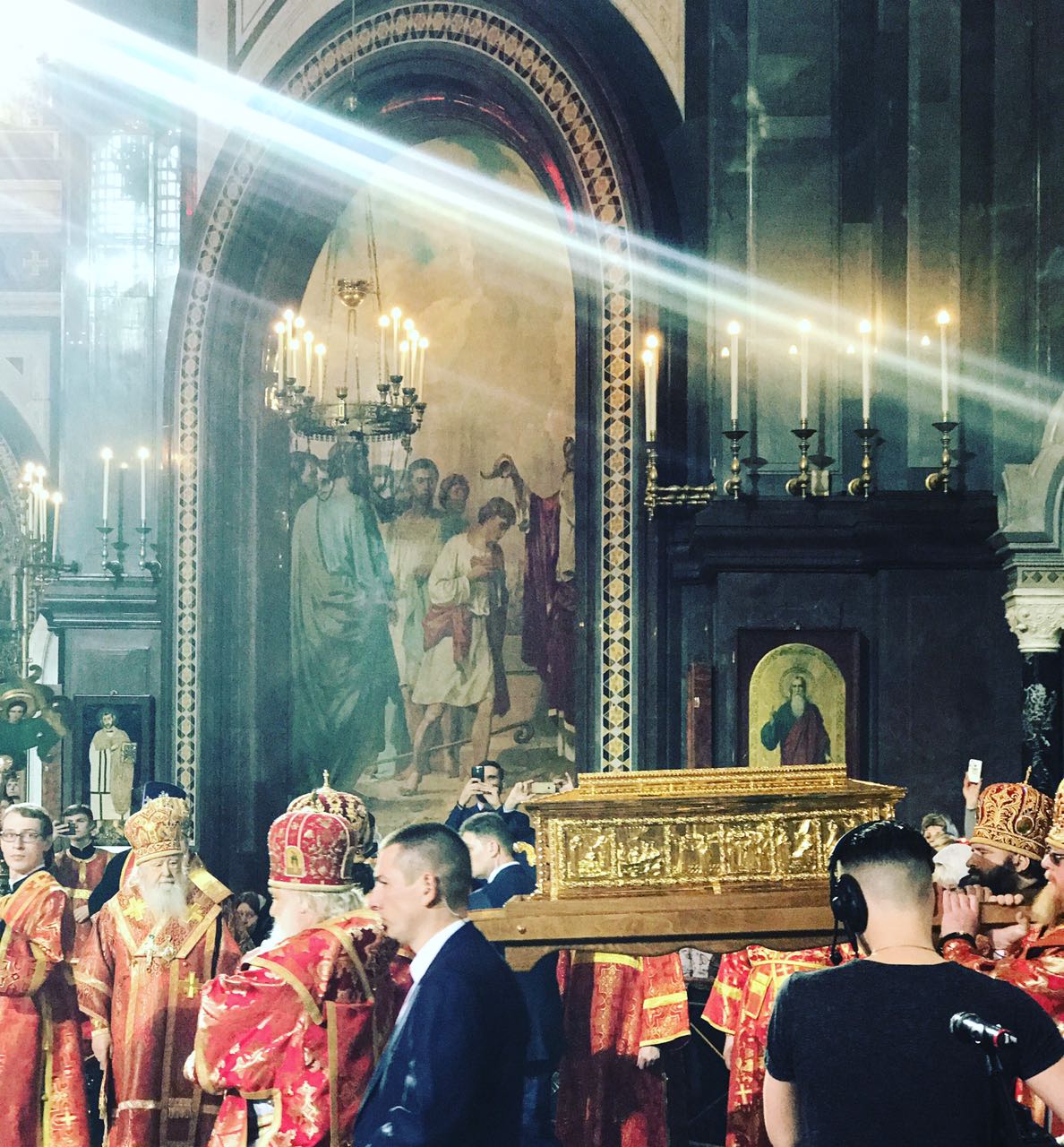 Хор поет великолепно, как и должно петь в главном соборе столицы. Служба пролетает на одном дыхании. Спокойствие, умиротворение, благоговейная тишина. Никакого ажиотажа и суеты, никаких разговоров и даже шепота не слышно среди верующих, да и журналистов, которые теперь общаются кивками. Все знают, за чем пришли. Внутреннее напряжение не скрыть. Люди со своих мест то и дело кидают взгляд на массивные двери храма, через которые вот-вот внесут бронированный ковчег. Время от времени двери открываются, но не распахиваются, и нам остается только догадываться о происходящем за стенами.