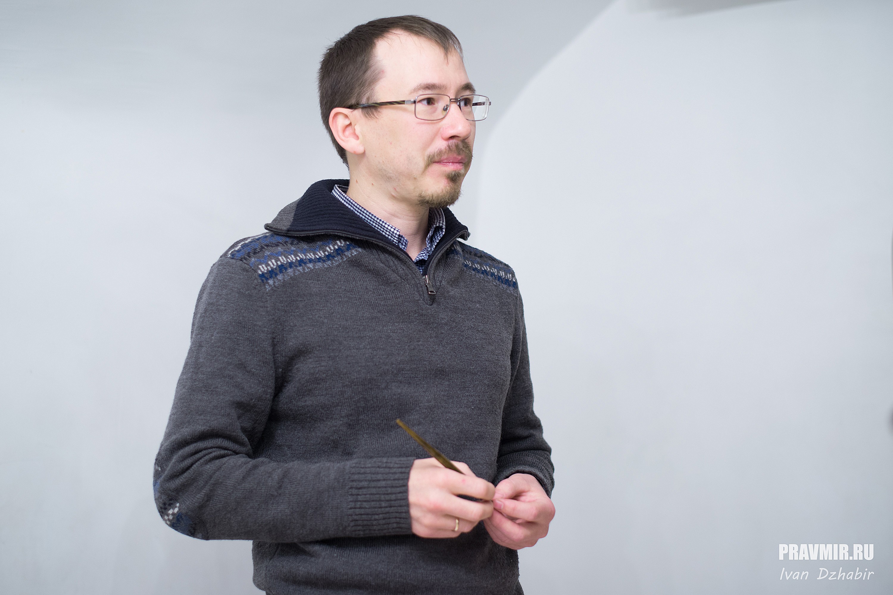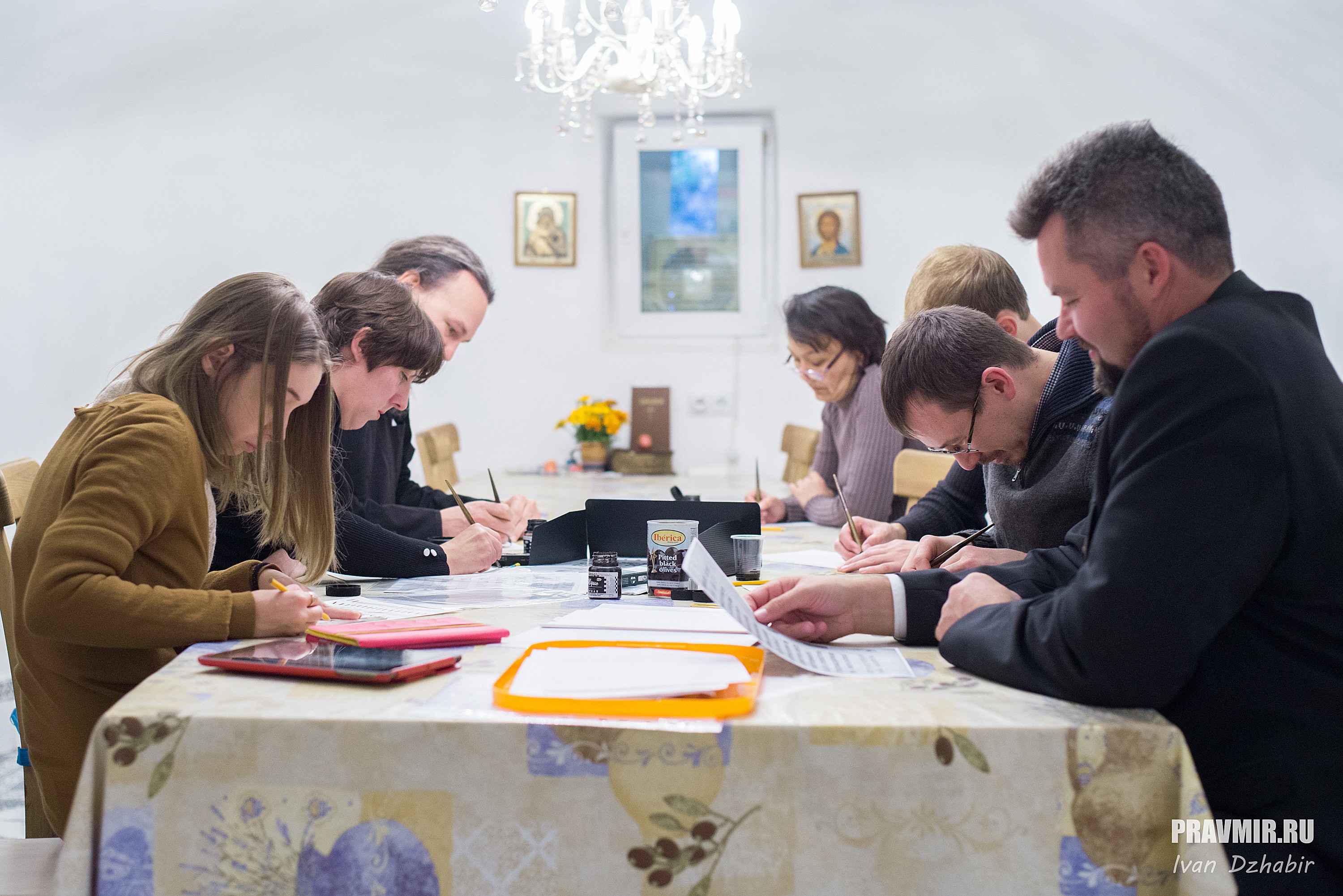 Сегодня не учебный день, и всё равно в класс каллиграфии в цокольном этаже Введенского храма заглядывают прихожане – каллиграфия требует постоянства. Преподаватель Виктор Новиков раскладывает учебный материал и рассказывает, что освоить навыки правильного и красивого письма может каждый – для первых шагов в каллиграфии не нужно иметь красивый почерк или художественный талант, важны усидчивость и практика.
