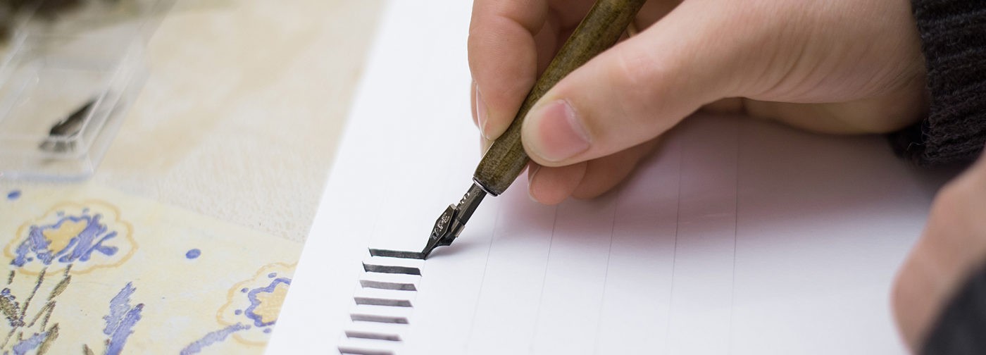 Расчерчиваем бумагу, отмечаем по линейке линии по полтора сантиметра – примерно такой высоты буквы потом будут вписываться в строку. Затем заполняем перо тушью. На занятиях все пишут стальными перьями. Они более жесткие, и по своим свойствам больше похожи на дерево. У этих перьев специальные тушедержатели, чтобы тушь не вытекала вся сразу – так легче провести линию.