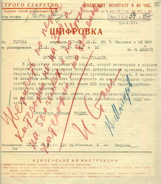Запрос секретаря Кировского обкома М. Н. Родина на увеличение лимита по «изъятию» на 300 человек по «первой категории» и на 1000 человек по «второй категории», красным карандашом указание И. В. Сталина увеличить не на 300, а на 500 человек по первой, и увеличить не на 1000, а на 800 человек по второй категории. 22 октября 1937 года.