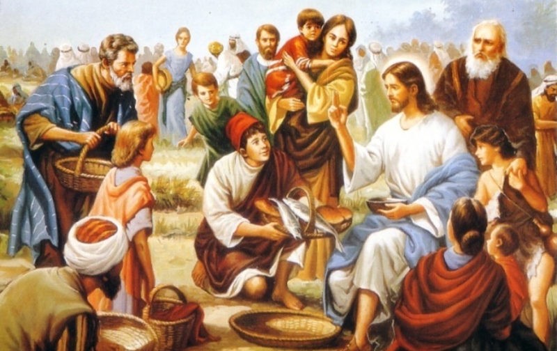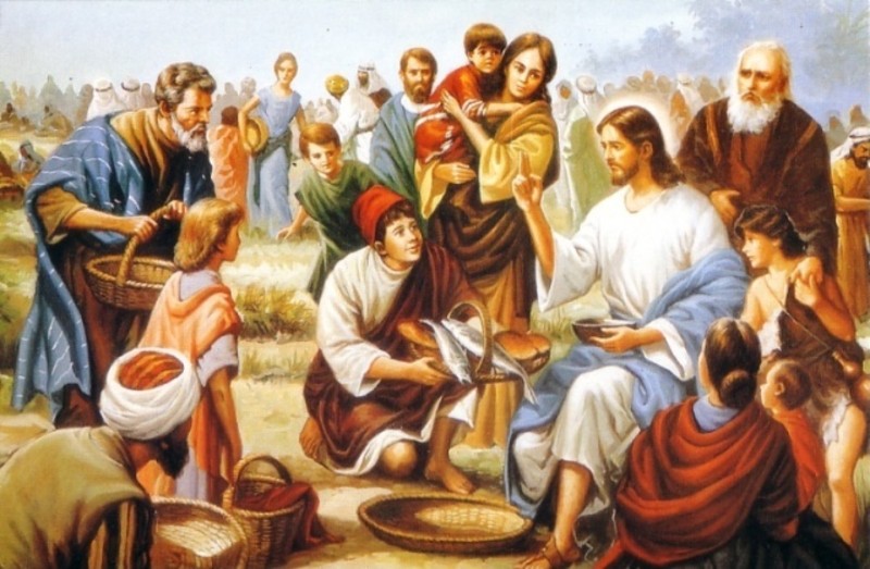 И вот Христос говорит ученикам: Нет, им не нужно уходить, дайте вы им есть… Но как они могут накормить такую толпу людей, мужчин, женщин и детей, у них всего-то пять хлебов и две рыбки? И тут — вызов Христа ученикам и вызов Христа нам. Да, в каком-то смысле один только Бог может совершить это чудо, но только если мы со-действуем этому чуду открытостью нашего сердца и открытостью наших рук, вложив в чудо всё, что у нас есть. Христос не сказал ученикам: Сберегите то, что вам нужно самим, и отдайте остальное, отдайте другим то, что останется; Он сказал: Возьмите всё, что у вас есть, и отдайте всё.