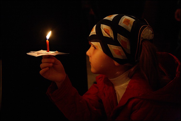 Подумать только — мя прослави! Мы поем и смотрим друг на друга, словно нас уже приняли в Царство Небесное. А в эту минуту оно, это Царство, и в самом деле рядом. Народ нежно помогает друг другу возжигать задуваемые ветром свечи, не переставая петь: «…и нас на Земли сподоби чистым сердцем Тебе славити».