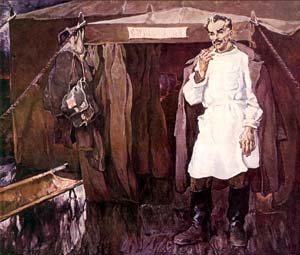 Дедушка пошёл в армию добровольцем 23 июня, на следующий день после начала войны (ему было в ту пору 46 лет), и его тотчас призвали, так как он имел уже большой опыт и Первой мировой, и гражданской, и работал врачом в условиях, «близких к боевым», — на подъёме Голодной степи. Готовился он и к отправке добровольцем — военврачом — в Испанию, но не успел.
