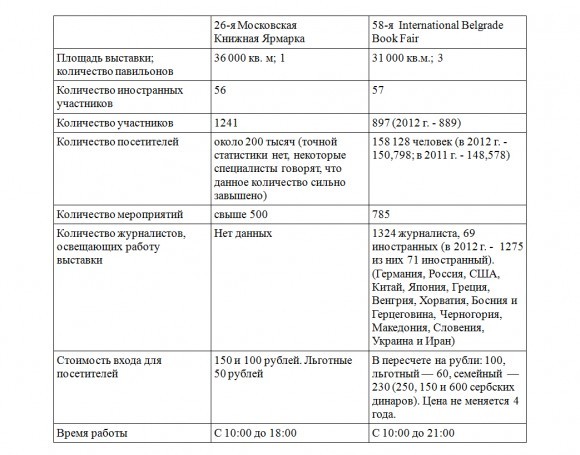 Сравнительные данные показывают, что наши выставки примерно равны. Но у нас с каждым годом наблюдается уменьшение числа посетителей, участников и журналистов, а в Сербии все наоборот. Количество посетителей сербской выставки действительно впечатляет. Издатели говорят, что за семь дней выручка одной компании-участника достигает 200 тысяч евро, что значительно превосходит доходы участников московской ярмарки. Людей и покупателей на белградской выставке очень много.