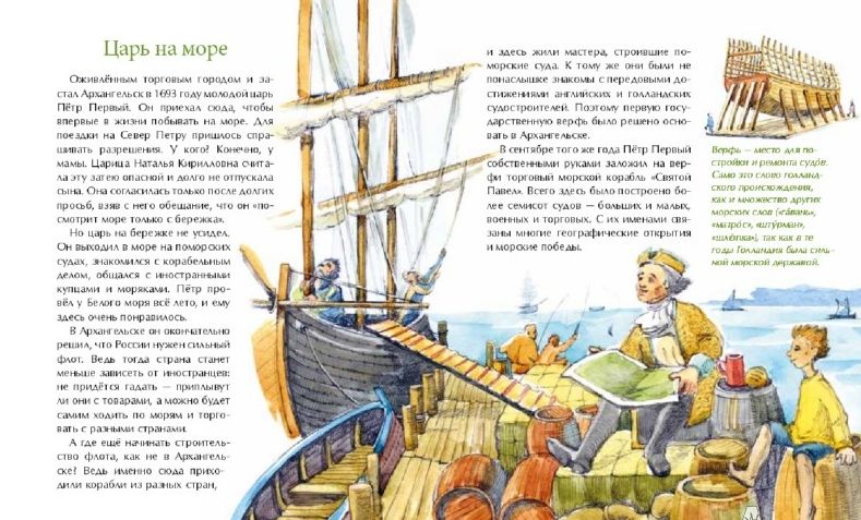 Широка страна моя родная — столицы мы посмотрели, едем дальше. Можно остаться на северо-западе России с путеводителем того же издательства с заманчивым названием «От Пскова до Архангельска» и побывать по дороге во всех городах, которые только попадутся на пути — Изборске, Печорах, Пушкинских Горах, Великом Новгороде, Вологде, Каргаполе и даже на Соловках! Хотите об Архангельске ещё больше? Тогда читаем книжку Елены Максимовой «Архангельск. Город у Белого моря». («Настя и Никита») Узнаем, кто такие поморы, что такое верфь и почему мама не пускала молодого царя Петра Первого на море. Да, о царях тоже беспокоятся мамы.