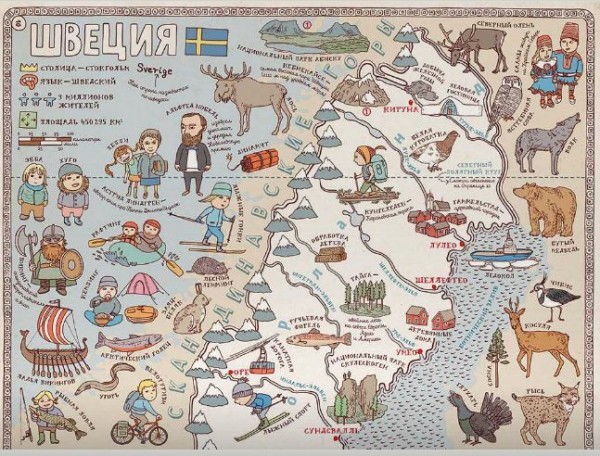Вот, например, Швеция. Конечно, изображены шведы в национальных костюмах, даны название столицы, площадь страны, число жителей и животные, которые обитают на этой территории. А ещё — викинги, Астрид Линдгрен, Альфред Нобель, деревянные дома, хоккей на льду, брусничный джем и шведский стол. И многое другое, без чего сухие цифры ни за что бы не ожили. А вот вам Китай — пожалуйста: тутовый шелкопряд, фарфор, чай, тофу, фейерверк, воздушный змей, кунг-фу, трепанги… Вся книжка выполнена в очень деликатной цветовой гамме, картинки очень узнаваемые, симпатичные, но при этом полны иронии.