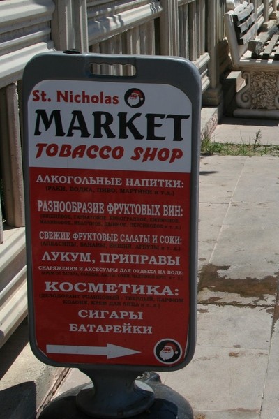 В пяти минутах от храма вывески зазывают в табачный магазин святителя Николая.