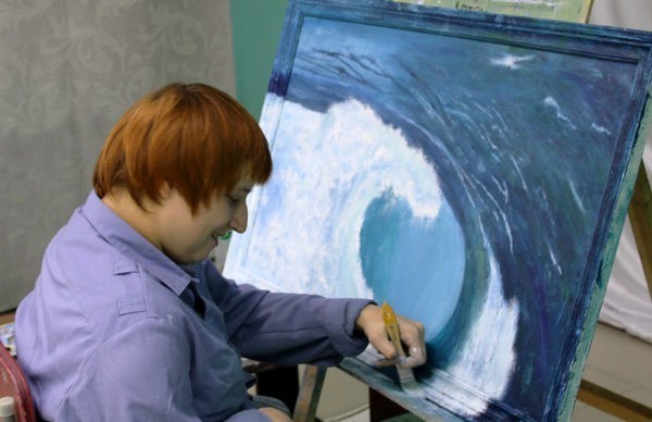 Например, из-за гиперкинезов Насте бывает трудно сконцентрироваться и сделать точные мазки. Или случайно не туда падает кисть, тогда надо исправлять, пытаться снова и снова, пока фрагмент не получится таким, как хочет мастер. Или руке нужна опора, чтобы увереннее писать.