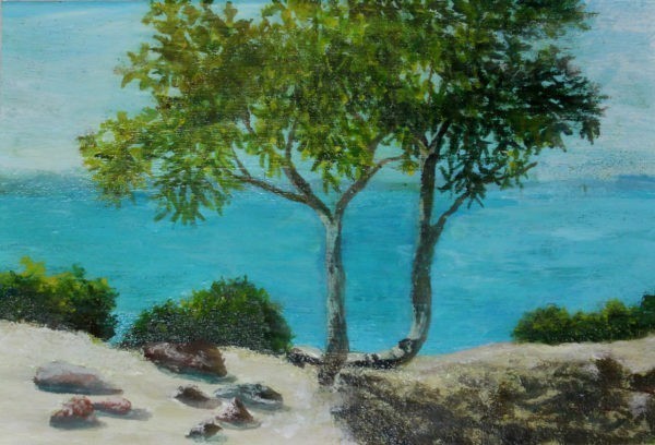 Настя любит «зависать вниманием» на ветках деревьев, особенно летом, в солнечную погоду. Деревья сами по себе очень достойный объект для художественного исследования: редко встретишь прямую, как кол, ветку, все разные, изящно изогнуты. А если повезло и день солнечный, если есть листва, можно наблюдать игру света и тени: где проходит граница между ними, от какого листочка, как, куда падает тень, какого она оттенка — так рождаются Настины картины.