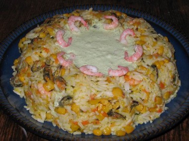 Выложить на сервировочное блюдо, с помощью двух столовых ложек придав рису форму кольца. В середину кольца положить взбитые сливки с креветками.