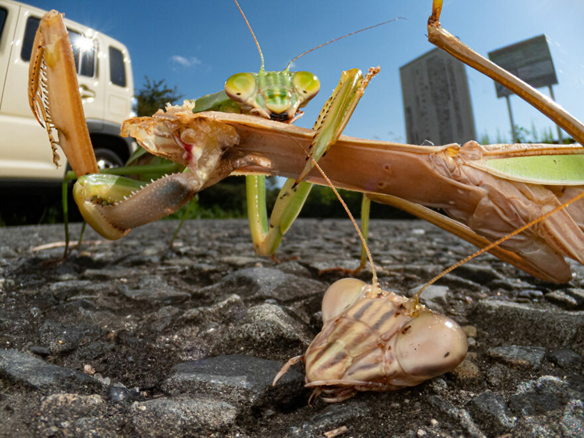 «Добыча», Такуя Исигуро. Осаки-ши Мияги-кен, Япония. Обычно китайских богомолов можно встретить на влажных лугах, но этого фотограф заметил на обочине дороги. Эта самка пожирает своего самца — такое случается не всегда, а только когда насекомым не хватает еды.