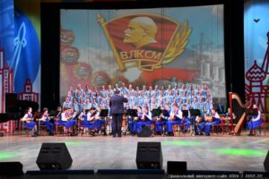 Я вышла вслед за пожилой парой, чтобы отдышаться. Когда вернулась, юные пионеры уже рядком теснились на сцене и произносили до боли знакомые слова. Они почти не изменились: все эти «торжественно клянусь» и прочие пассажи всплывали полузабытыми блоками в моей голове. Дальше были «калинка» и «катюша» от оркестра Локтева, «орлята учатся летать» и «любовь, комсомол и весна» от хора имени Попова. На дороге к светлому будущему коммунизма собравшихся сопровождал неизменный Ленин на заднике сцены, разбавленный митингами на Красной площади, счастливыми лицами советских комсомольцев, ракетами и Гагариным. Гагарину, кстати, хлопали больше всего.