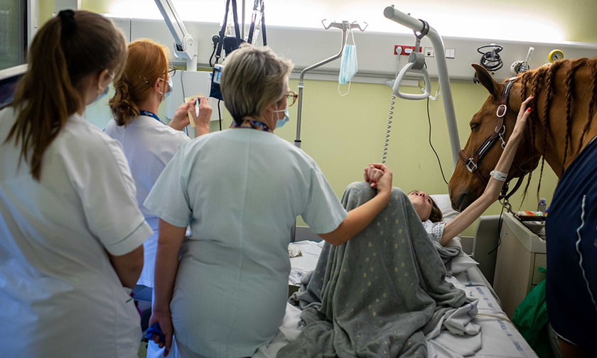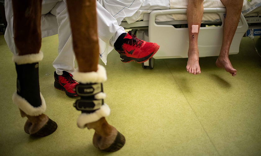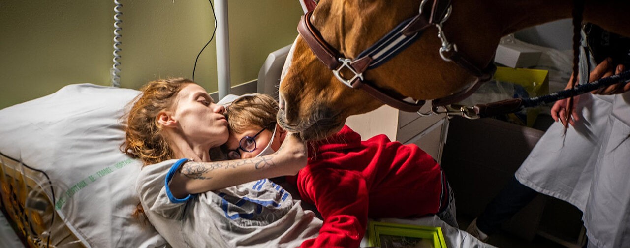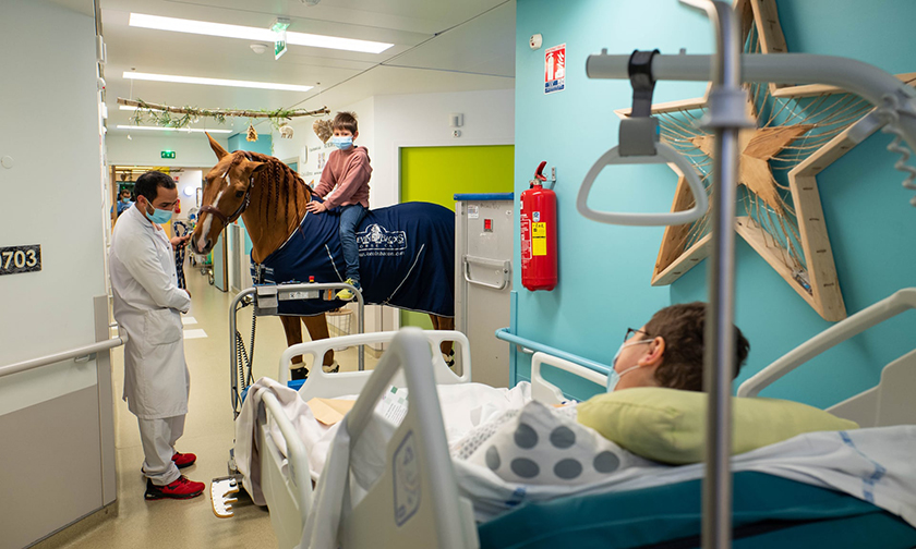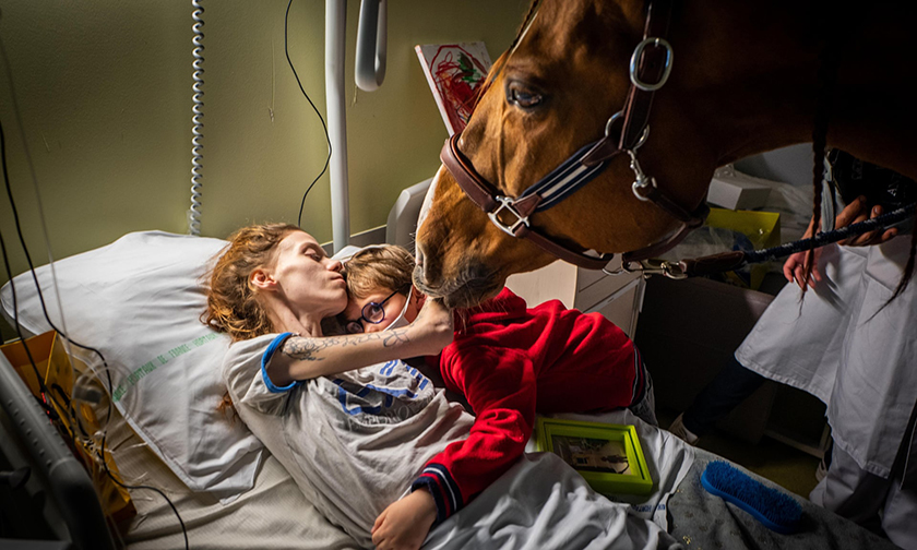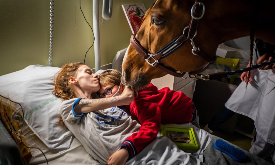 Девятилетний Исаак с гордостью показывает своего нового друга Пэйо матери, которая только что вышла из операционной. «Исаак связал больницу с Пэйо. Он счастлив приехать в больницу, чтобы увидеть свою мать, — и это благодаря этой лошади», — говорит его отец Томас.