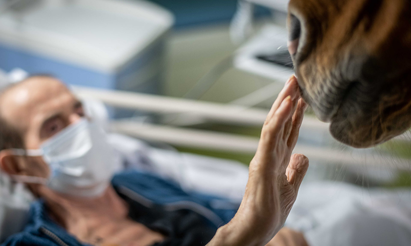 Марион гладит Пэйо, в то время как медицинская бригада пытается облегчить ее боль. У Марион — рак с метастазами. Она говорит, что Пэйо и Бушакур — ее союзники и приходят к ней почти каждый день. «Хассен и Пэйо — часть команды, они полезны не только для пациентов, но и для нас. Когда тяжело, мы рады, что они рядом», — говорит Энн Софи, медсестра центра паллиативной помощи.