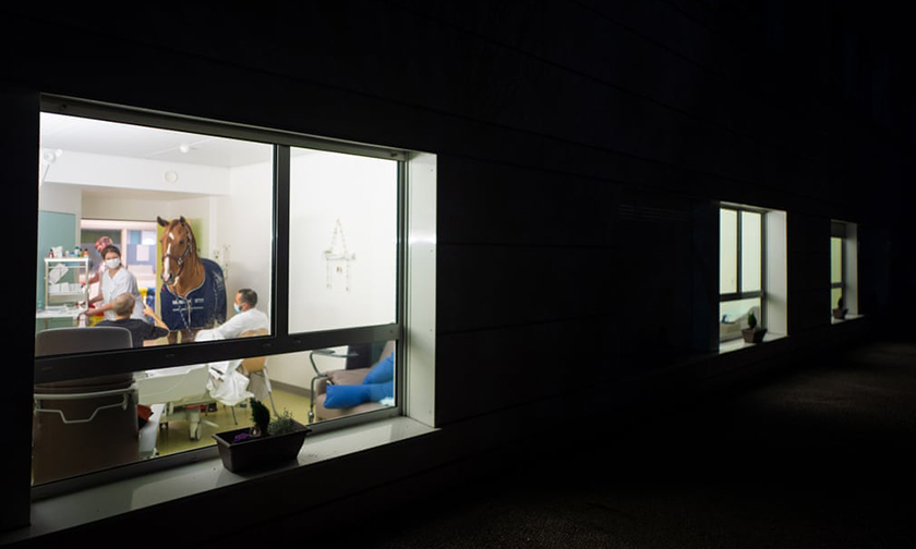 Пэйо охраняет дверь пациента, пока Бушакур разговаривает с медицинской бригадой. «Хассен и Пэйо обеспечивают комфорт не только пациентам, но и нам тоже. В трудных ситуациях мы очень рады видеть их рядом», — говорит Саид Натали, медсестра центра паллиативной помощи.