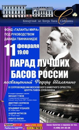 7 февраля. ПРАВМИР. 11 февраля 2012 года в 19.00 в Москве в концертном зале Центра Павла Слободкина Фонд «Таланты мира» под руководством Давида Гвинианидзе проведет концерт, посвященный Федору Шаляпину, – «Парад лучших басов России» в сопровождении Московского камерного оркестра Центра Павла Слободкина.