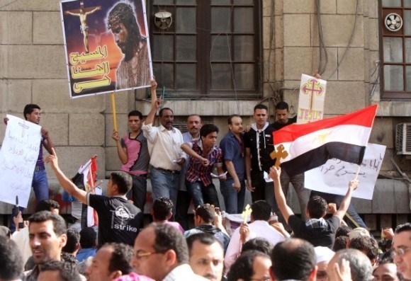 В центре Каира на митинг протеста, посвященный событиям предыдущей ночи, собрались тысячи коптов. Сначала они протестовали у здания генеральной прокуратуры, а затем двинулись мимо здания Верховного суда к национальному телецентру. В этот момент в толпу полетели камни, а с крыши одного из зданий даже бутылки с зажигательной смесью.