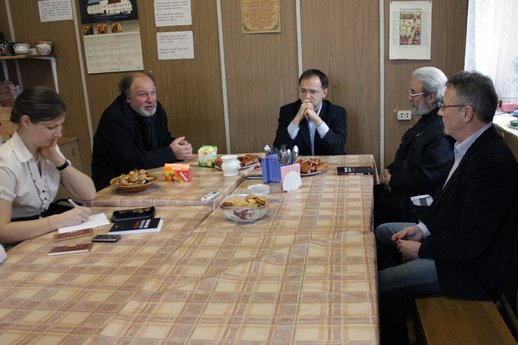 14 апреля в храме Всемилостивого Спаса прошел круглый стол по актуальным проблемам российской топонимии, на котором присутствовали учредители фонда «Возвращение» – глава Издательства Московской Патриархии протоиерей Владимир Силовьев, депутат Государственной думы Владимир Мединский, президент Фонда Юрий Бондаренко, а также настоятель храма Всемилостивого Спаса протоиерей Александр Ильяшенко и главный редактор портала «Правмир» Анна Данилова.