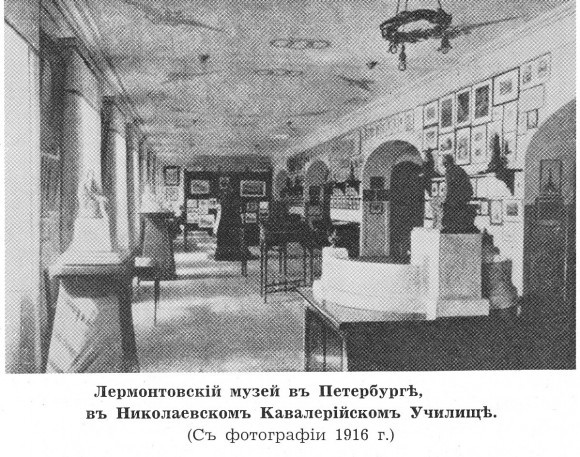 Помещение 2-го взвода, в котором состоял Лермонтов, считалось «Лермонтовским взводом», равно как и весь состав этого взвода, а одна из комнат классного флигеля была всецело посвящена ему и носила название «Лермонтовский Музей». В него были перенесены бумаги из обоих столичных университетов, скудно освещавшие студенческие годы великого поэта. Там же сохранялись его подлинные рукописи, рисунки и несколько принадлежавших ему вещей. Заведовал музеем полковник Граве, почему-то строго следивший, чтобы при посещении музея мы не имели при себе ни бумаги, ни карандашей.