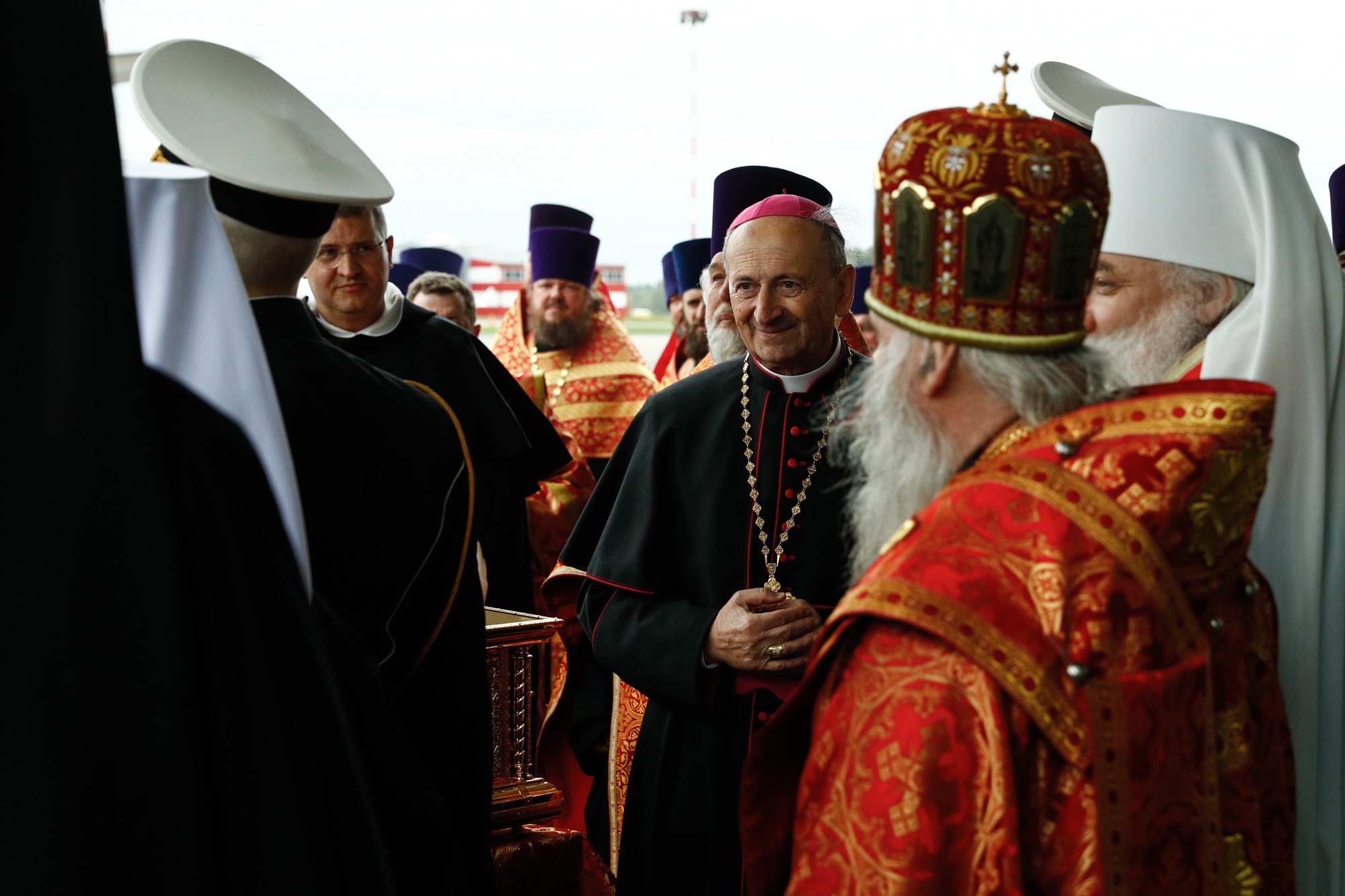 Святыню сопровождали председатель Отдела внешних церковных связей Московского Патриархата митрополит Волоколамский Иларион, руководитель Управления Московской Патриархии по зарубежным учреждениям епископ Богородский Антоний, сотрудник Секретариата ОВЦС по межхристианским отношениям священник Алексий Дикарев.