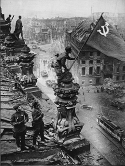 Утром 2-го мая военный корреспондент Евгений Халдей приехал в Берлин. Он намеревался запечатлеть символическую картину победы Красной Армии в битве за Берлин. У здания Рейхстага, которое к тому времени уже полностью находилось в руках Красной Армии, он собрал несколько стоявших поблизости солдат, поднялся с ними на крышу и инсценировал, вероятно, самое известное фото перепечатанное сотни тысяч раз: изображение красноармейца, размахивающего красным знаменем. Однако эта сцена не имела места в реальности. В действительности, вечером 30 апреля 1945 года красное полотнище было вывешено из окна верхнего этажа расстрелянного здания парламента. Тем не менее, превосходная инсценировка Халдея возникает перед глазами каждого, кто вспоминает о падении Берлина. А немецкие коммунисты в это время уже думали о будущем: в то же утро, в 40 км к востоку от разрушенной столицы рейха в Брухмюле, автомобильная колонна «группы Ульбрихта» двинулась в направлении центра. Вольфганг Леонард, самый молодой в группе, вместе с восемью выбранными коммунистами, находившимися в изгнании, должны были поддержать советское правительство в скорейшем установлении немецкого правительства с превалирующим числом коммунистов и просоветских сил. Уже на следующий день они приступили к выполнению этой задачи.