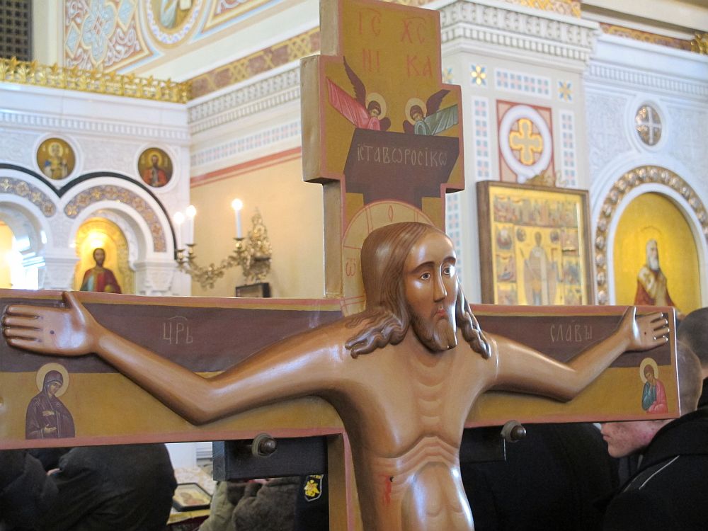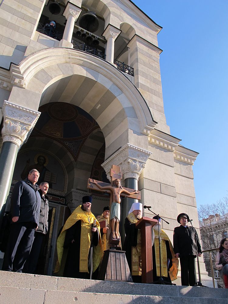 Путешествие копии Креста Господня из Годеново по Севастополю начиналось достаточно скромно — на литургии в день апостола Андрея Первозванного во Владимирском соборе в Херсонесе, на месте крещения святого равноапостольного князя Владимира. Рабочий день, народу не очень много. У праздничной иконы — ковчежец с мощами святого апостола Андрея Первозванного. А справа от иконы — большое резное распятие. Широкой предварительной «рекламы» прибытие этой святыни не получило, и некоторые прихожане спрашивали друг у друга, чем она примечательна.