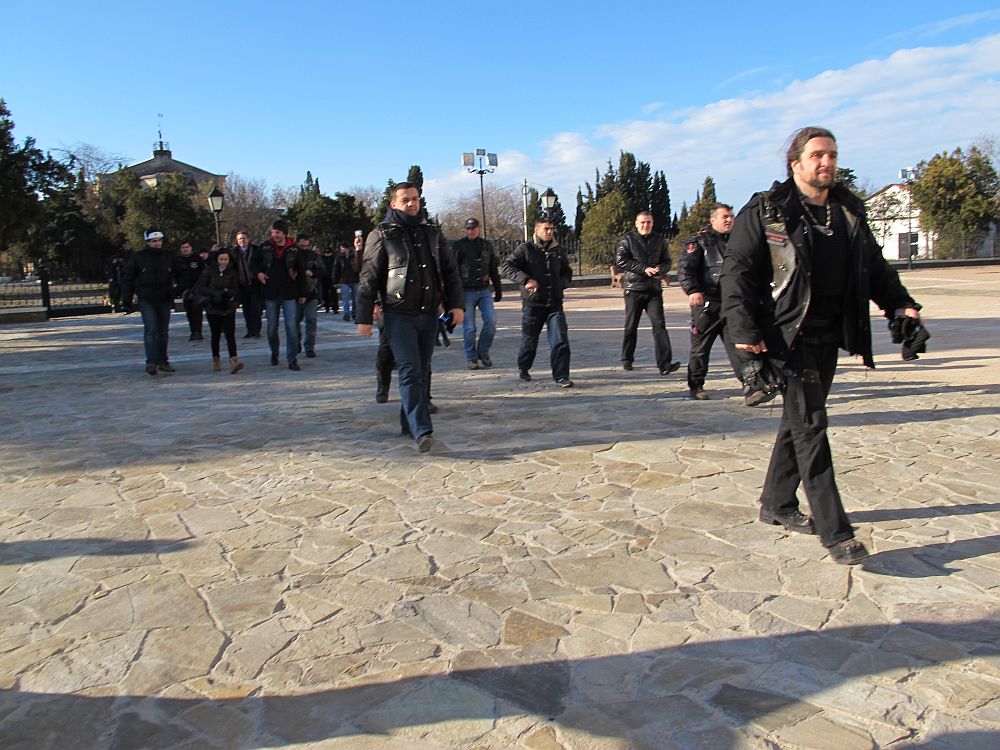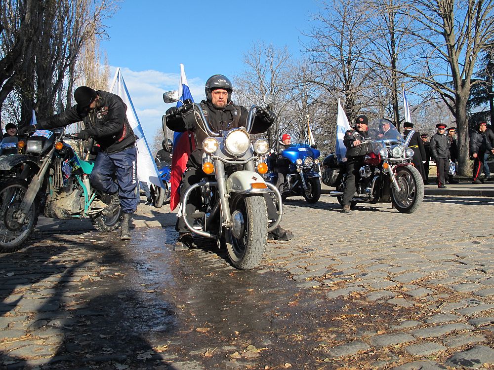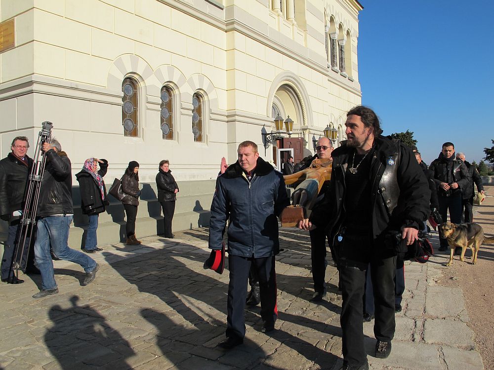 «Ночные волки» любят Севастополь, и принесение копии Годеновского креста без их участия не обошлось. Их не было видно на литургии, но за пять минут до начала крестного хода на двор херсонесского собора уверенно вошел Хирург (Александр Залдостанов) с товарищами и журналистами, и вскоре святыня оказалась на машине, а следом двинулась кавалькада брутальных мужчин с наколками и в куртках с клепками. На каждом байке развевался Андреевский флаг, и полотнища буквально светились на солнце. От одного Владимирского собора до другого, от Херсонеса до Центрального холма — от силы 15 минут езды, и это довольно динамичный и зрелищный вариант крестного «езда».