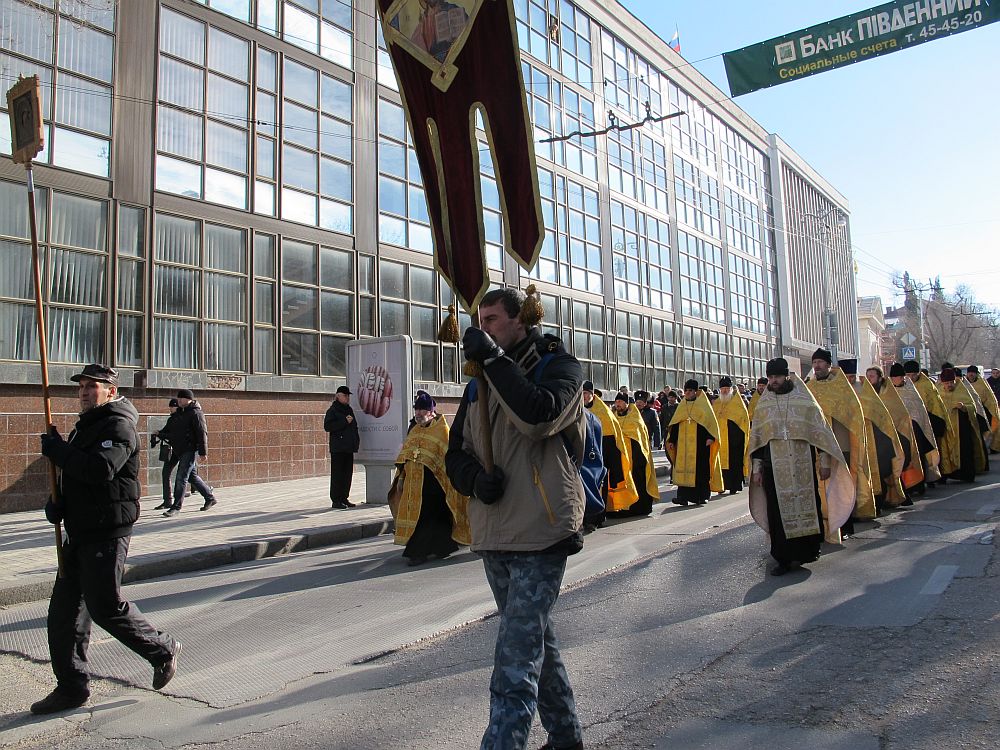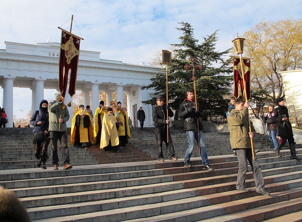 От ступеней Владимирского собора до Графской пристани прошли крестным ходом — мимо памятника Ленину на Центральном холме, по улице Ленина мимо Дома офицеров флота… Молились апостолу Андрею и князю Владимиру, осеняли крестом город на четыре стороны.