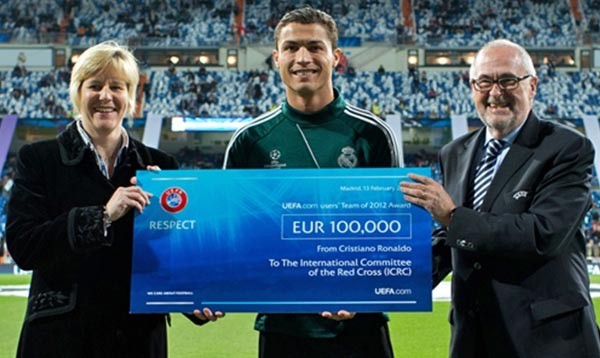 100 000 евро Роналду перечислил «Красному кресту», полтора миллиона фунтов за проданную на аукционе золотую бутсу он перевел палестинской школе в секторе Газа.