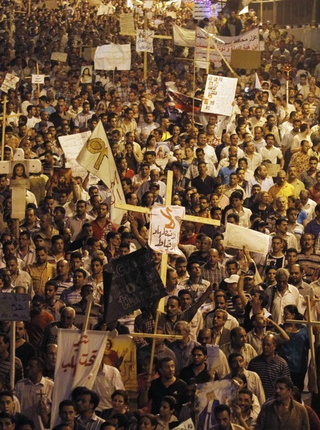 Копты в знак протеста вышли на улицы с требованием защитить христиан, начались стычки между полицией и демонстрантами. Одни новостные источники сообщают, что христиане стали ни с того ни с сего бросать бутылки с зажигательной смесью в полицию, по сообщениям других источников, демонстрации перестали носить мирных характер. когда в коптов стали бросать камни, и они начали отвечать на агрессию.