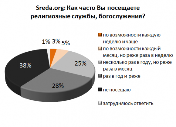 3% россиян посещают церковные службы раз в неделю и чаще, самый популярный ответ — «не посещаю», его выбрали 38% опрошенных.