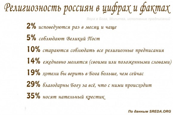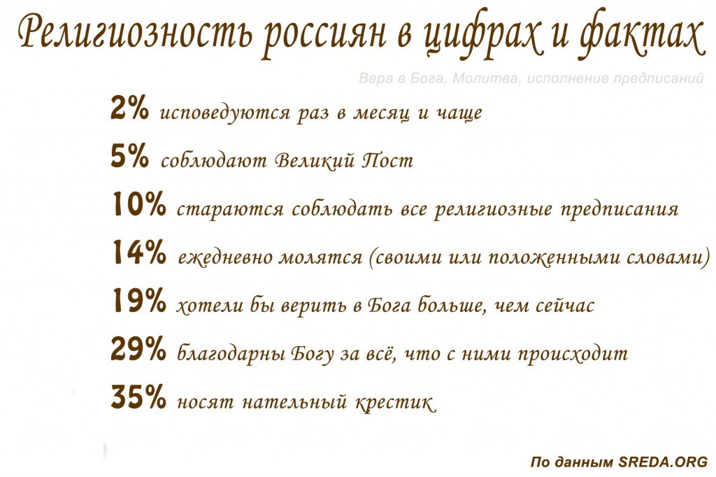 46% носящих нательные кресты, 58% занимающихся благотворительностью, 59% соблюдающих Великий пост.