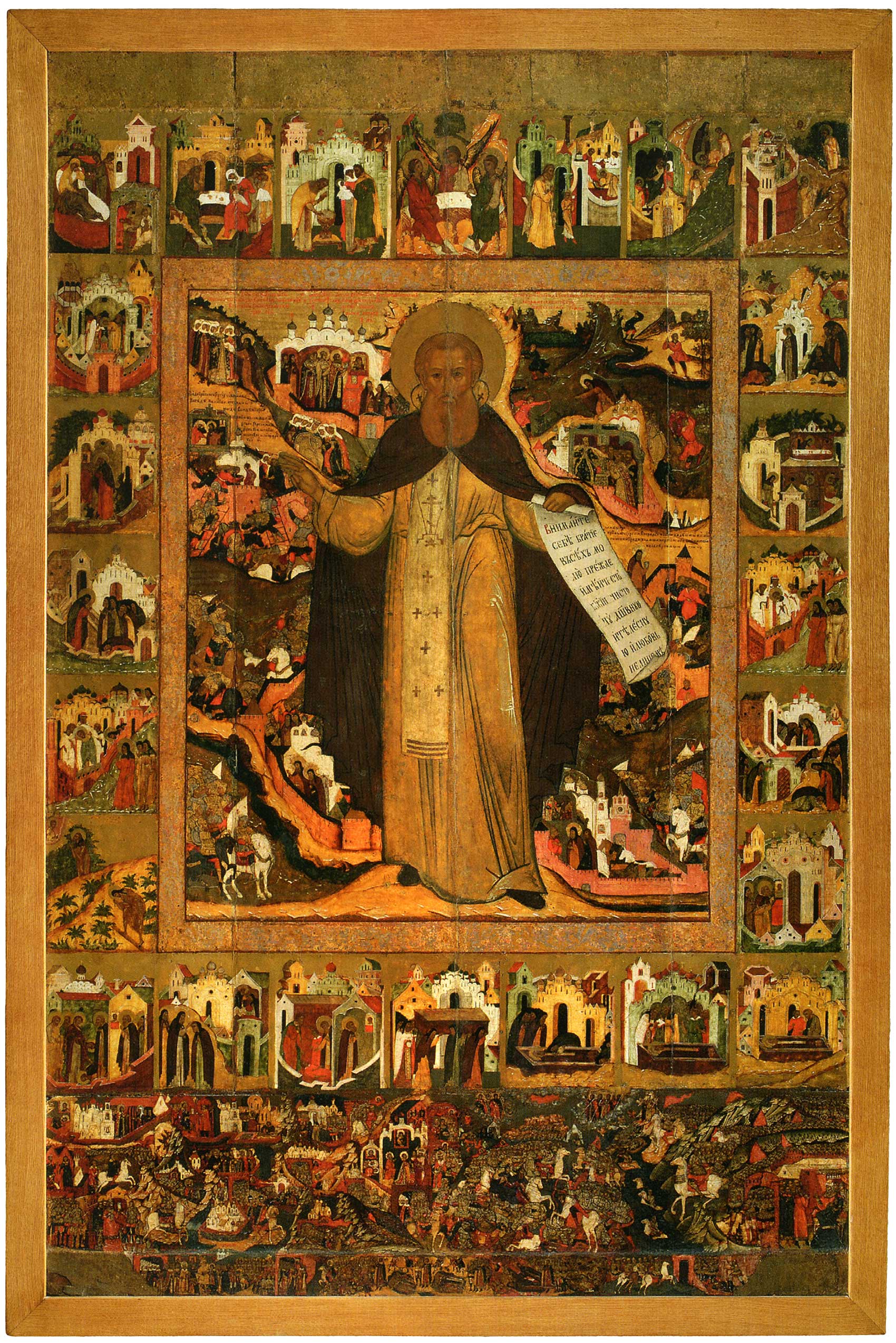 Первой работой над образом святого стала картина «Видение отроку Варфоломею» (1889-90). Работа была куплена Третьяковым, имела успех, но публикой была оценена неоднозначно. Зато сам Нестеров утвердился в своем желании написать «житие» великого подвижника земли русской, тем более что в 1892 году в России должно было отмечаться 500-летия со дня Успения преподобного Сергия, игумена Радонежского. Так появляется «Юность преподобного Сергия» (1892), триптих «Труды преподобного Сергия» (1896-97) и «Преподобный Сергий Радонежский» (1899).