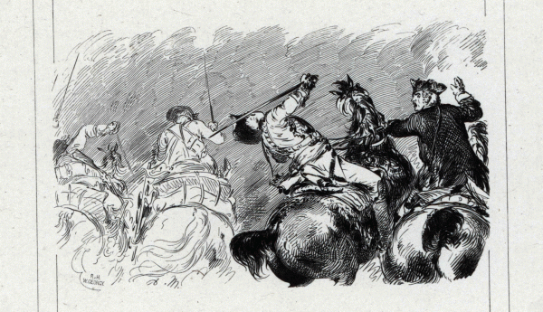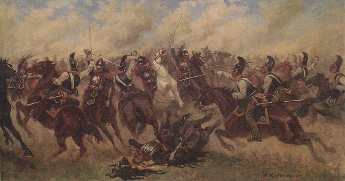 «…Преследовавший неприятеля с легким войском генерал-майор граф Тотлебен в ночь меня рапортовал, что он чрез болото в лес к неприятельскому левому крылу казаков послал, чтоб кавалерию от пехоты отрезать, а он с гусарами и кирасирскими Его Императорского Высочества полку 2-мя эскадронами, кои весьма храбро себя оказали, по сю сторону болота построился; неприятельская кавалерия, усмотря, что казаки заезжают с тылу, ретироваться стала, но в то время оная с обоих сторон казаками и гусарами атакована, расстроена и разбита, многие поколоты и в полон взяты, в сверх того целый неприятельской от протчих отделившийся кирасирский эскадрон 20-ю человеков казаков и 15-ю человек гусар в болото вогнан, побит и пленен, которого стандарт в добычу взят; от сего места далее мили за неприятелем погоня была…»