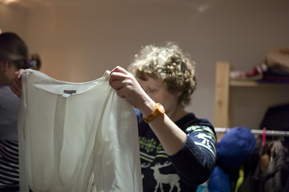 От обычных магазинов лавка отличается тем, что вещи здесь надо искать. Внутри есть несколько стоек с вешалками, но одежда на них всё равно висит вперемешку, рассортирована она лишь приблизительно: мужское, женское. В самой глубине взгляд натыкается на подвесной мешок из IKEA; детских вещей в нём столько, что хватило бы на пафосный отдел одежды.